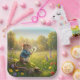 Maus pustet Löwenzahnsämlinge aus Pappteller