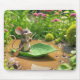 Eine kleine Maus navigiert durch eine schlammige Pfütze mit einem gekuppelten Blatt als Boot, umgeben von blühenden rosa-weißen Blume und üppiger Vegetation