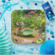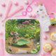 Eine kleine Maus navigiert durch eine schlammige Pfütze mit einem gekuppelten Blatt als Boot, umgeben von blühenden rosa-weißen Blume und üppiger Vegetation