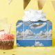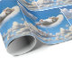 Niedliche Maus, die auf einer weißen Feder schwebt, die in einem Sommerhimmel schwebt