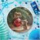 Zwei Mäuse interagieren spielerisch um einen glänzenden, roten Weihnachtsschmuck, der an einem Tannenarm hängt
