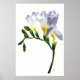 Ein farbiges Bleistiftgemälde von zarten blasslila Freesien auf weißem Hintergrund.