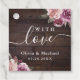 Botanisches Watercolor Blumendesign in Lila lila, Maulbeere, staubige Rose und Pfirsichfarben auf dunklem Stallholzkornboden, modernes Drehbuch "mit Liebe" mit Pärchennamen und Veranstaltungsdatum, moderne und elegante personalisierte Gastgeschenk Hochzeit Tags für rustikale botanische Gartenhochzeiten im Herbst und Winter.