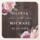 Botanisches Watercolor Blumendesign in Lila lila, Maulbeere, staubige Rose und Pfirsichfarben auf dunklem Stallholzkorn, moderne Pärchennamen und Veranstaltungsdatum, moderne und elegante, großartige personalisierte Hochzeitspapier-Untersetzer für rustikale botanische Gartenhochzeiten im Herbst und Winter. Sehen Sie sich alle passenden Stücke in der Sammlung an.