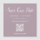 Mauve Minimalistisch QR Code Speichern Sie das Date Magnet Vermeiden Sie die Mühe, indem Sie Ihre Freunde online mit einem QR-Code einladen, der sie direkt an die Hochzeitswebsite schickt, um weitere Details zu erhalten. Das Design ist minimalistisch und schlicht in Lila und Weiß, mit einer modernen und sehr eleganten Kalligraphie gerettet unserem Datum. Ersetzen Sie einfach Ihren eigenen QR Code und Ihre persönlichen Daten Ihrer Wahl.