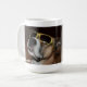 Ein Haustier-Hund nannte Max geschossenes nahes oben mit der Zunge heraus und den Sonnegläsern an. Auf einer Schale.