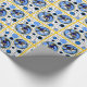 Cheery Hanukkah-Geschenkpackung hat schwarze auf weißen Polka-Punkten mit dreiblütigen, kornblühblauen orbs & medallions geschmückt mit Leslie Sigal Javoreks skurriler Variation eines Maxfield Parrish elfish Lamplighter Charakter w/polka dot Leggings, kobalt blauer Pancho, ein voll beleuchtet ah auf seinem Schuh, der Gruß, "Happy Hanukkah" & alle grenzt an dunkelgelb!