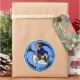 Dekorieren Sie Ihre Umschläge, Geschenkpakete & mehr mit IconDoEs ist eine originelle Variante eines klassischen Maxfield Parrish Elf-Charakters aus den 20er Jahren mit weißen und schwarzen Polka-Punkten Leggings + Kobalt blauer Pancho + eine Menorah auf seinem Schuh, auf einem gewinkelten Hintergrund und der Gruß "Happy Hanukah". Wählen Sie aus 2 Größen