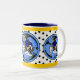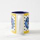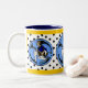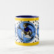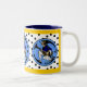 Freuen Sie sich auf eine Tasse aus der Zeit vor dem Ersten Weltkrieg, in der Jewbilees originelle Variation eines Maxfield Parrish Elfs mit weißen & schwarzen Polka Dots Leggings+a menorah auf seinem Schuh+Gruß "Happy Hanukkah" auf der Periwinkelmedallion, Polka Dot & sonngelben Rändern.