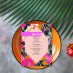Hellrosa 6-seitige geometrische Form über rosa Orange und pfirsichfarbene moderne Blumen mit dunklem Marmor. Rosa "Menütext" über lila Bar mit schwarzem Text darunter.