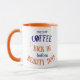 Funny coffee mug with the text "May your coffee kick in before reality does" on both sides of the mug.