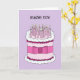 Ein großer Cartoon, mit Kerzen bedeckt, ein Geburtstagskuchen, ein Set in Lila. Die Worte "Mazel Tov" sind über dem Kuchen.