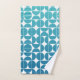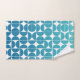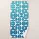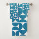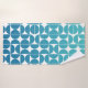 Ein Muster mit retroblauen geometrischen Formen, die in einem Raster angeordnet sind, und mit Kreisen und Halbkreisen, die von Licht zu Dunkel variieren. Das Design schafft einen optischen Täuschungseffekt mit seiner repetitiven und Mitte des Jahrhunderts angeordneten Anordnung.