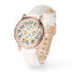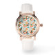 Diese Frauenuhr hat ein modernes Design aus konzentrischen Kreisen in Gold, Orange und Türkis auf weißem Hintergrund.