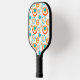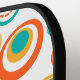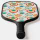 Dieses Pickleball-Paddel hat ein modernes Design von konzentrischen Kreisen in Gold, Orange und Türkis auf weißem Hintergrund.