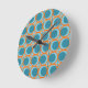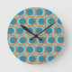 Diese Wanduhr hat ein modernes Design aus offenen orangefarbenen Kreisen mit festen aquamarinen Kreisen, die über das Muster laufen, mit aquamarinen vertikalen Linien und orangefarbenen horizontalen Linien auf einem aquamarinen Feld.
