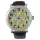 Diese Herren-Uhr hat ein modernes Design aus halbmondförmigen Monden, die horizontal in drei Farben unterteilt sind, rosa, blau, lavender oder seafoam, in zwei Hälften geteilt und auf einem Gitter mit gelbem Hintergrund verstreut. Wenn Ihnen das Design gefällt, aber verschiedene Farben will, schreiben Sie mir.