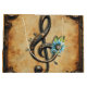Mechanical clef and flowers to the beat of the clocks. A steampunk-style treble clef, rendered in dark metal with bronze accents and intricate detailing. The clef is adorned with blue flowers that have clock faces at their centers, adding a whimsical touch. Musical notes float near the clef, and small droplets hang from its curves.