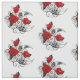 Contour, mechanical crescent moon with gears, decorated with red roses with black spiked stems and leaves on white background. Steampunk