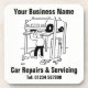 Garage Eigentümer Business trinkt Untersetzer. Personalisierter Untersetzer für einen Garagenmechaniker. Cartoon eines Mechanikers unter einem Auto, der Reparaturen und Wartung durchführt. Personalisieren Sie Ihre eigene Wortwahl und Ihre Kontaktdaten.