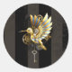 Steampunk, antiker, goldener, mechanischer Kolibri mit Messinggetrieben und silberner Taste auf gestreiftem, braunem Hintergrund. Goldvogel.