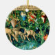 Ornament mit William Morris Tapestry Verdure with Deer and Shields (1891-1894). Eine grüne Hirschlandschaft, die aus einem Wasserbecken trinkt und von Blätter von Bäumen in einem grünen Wald gegessen wird. Über ihnen hängen die Schilde der Ritter des Runden Tisches. Ein großartiges Geschenk für Arthuriana-Liebhaber und Viktorianische Kunstsammler.
