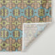 Ein kompliziertes geometrisches Muster besteht aus sich wiederholenden Quadraten und Rechtecken in Braun-, Gelb- und Blautönen. Das Design hat eine symmetrische, rasterähnliche Anordnung mit einem Vintagen oder Retro-Gefühl.