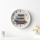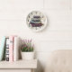 Eine Uhr mit einem Foto mit Steinen übereinander. Umgeben von weißen Felsen und kleinen weißen Blume.