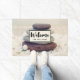 Ein Begrüßungstor mit einem Foto, auf dem Steine übereinander stehen. Umgeben von weißen Felsen und kleinen weißen Blume.