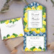 Erleben Sie Ihre Gäste mit dieser eleganten Hochzeitsfeier mit schönen Zitronen und Blätter mit moderner Typografie auf blauem Mosaikfliesenhintergrund. Fügen Sie einfach Ihre Veranstaltungsdetails zu dieser einfach zu bedienenden Vorlage hinzu, um sie zu einer einmaligen Einladung zu machen.