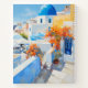 Treten Sie ein in ein mediterranes Badedorf mit diesem farbenprächtigen Farbdesign. Die hellen, weißen und blauen Gebäude sind von fröhlichen orangefarbenen Bougainvillea-Blume umgeben, die Pop verleihen. Dieses Kunstwerk ist beruhigend und ruhig, das ist der Inbegriff des Küstenlebens, perfekt für alle, die Lieben, dass klassische mediterrane Flair.