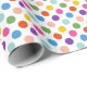 Medium scale round, rainbow colored dots of red, pink, yellow, green, aqua, blue and violet give this wrapping paper roll a cheerful flair perfect for birthdays, babies, and so many more occasions.