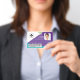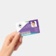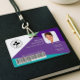 Modernes, farbenfrohes, geometrisches Muster mit modernem lila, aquamarinen und grünen abstrakten Musterhintergrund. Die Abzeichen-ID, das Logo, die Foto-ID, die ID-Nummer und der optionale Strichcode sind ordentlich angeordnet. Die Rückseite weist das gleiche Design mit Adresse und Logo auf.
