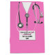 Kreative Geschenktasche mit rosafarbenen Krankenhauskeuchen, Stethoskop und lustigem Schweizer Armeemesser. Bearbeiten Sie den Text, um den Namen des Arztes hinzuzufügen.