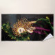 Medusa, lila mit gelben, schwarzen und roten Haarschwänzen. Eine große grüne Schlange hinter sich und umhüllt sie.