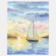 Meer bei Sonnenuntergang. Eine niedliche Yacht verlasst die Bucht und geht zum Meer. Die Aquarellbilder wurden gezeichnet und gescannt. Wasserfarbenlandschaft im Jahr 2024 im Freien gemacht.