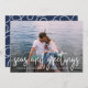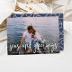 Senden Sie Ihren Urlaub Grüße an Freunde und Familie im nautischen Stil mit diesen schicken Küstenurlaub-Fotokarten. Design zeigt Ihr Lieblings-Foto mit "See und Grüße" überlagert in weißen handgezeichneten Buchstaben. Personalisieren Sie mit Ihren Namen, Gruß nach Maß (mit "Frohe Weihnachten" gezeigt) und das Jahr. Karten kehren zu einem weißen Seeseil-Muster auf der Küstenschifffahrt auf blau um.