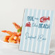 Kochen am Strand! Meeresfrüchte-Kochparty Junggesellinnen-Wochenende mit einer Krabbe und einem Hummer vor einem küstennahen blau-gestreiften Hintergrund