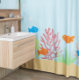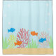 Meeresleben mit orangefarbenen und blauen Fischen inmitten eines Sandriffs aus Korallen und Algen inmitten von Meeresblasen.