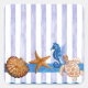 Original Aquarellmalerei von Sandra Gale, mit Sternfisch, Meerpferd, Schildkröten und Muscheln auf einem Hintergrund von senkrechten, lichtblauen Streifen. Das Design ist ausgezeichnet für den Sommer, die Zuhause, die Bungalows oder für alle, die den Strand, das Meer oder den Fisch Lieben.