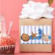 Original Aquarellmalerei von Sandra Gale, mit Sternfisch, Meerpferd, Schildkröten und Muscheln auf einem Hintergrund von senkrechten, lichtblauen Streifen. Das Design ist ausgezeichnet für den Sommer, die Zuhause, die Bungalows oder für alle, die den Strand, das Meer oder den Fisch Lieben.