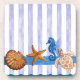 Original Aquarellmalerei von Sandra Gale, mit Sternfisch, Meerpferd, Schildkröten und Muscheln auf einem Hintergrund von senkrechten, lichtblauen Streifen. Das Design ist ausgezeichnet für den Sommer, die Zuhause, die Bungalows oder für alle, die den Strand, das Meer oder den Fisch Lieben.