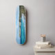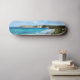 Die Aussicht auf das Meer in Aquarelle, das sich auf den weißen Sand stürzt, mit hohen Felsen und üppiger Strandvegetation an einem sonnigen bewölkten Tag
