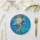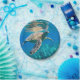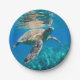 Unterwasseraufnahme einer Meeresschildkröte, die in kristallklarem Wasser direkt unter der Oberfläche schwimmt.