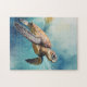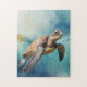 Aquarellbild eines nahen Teils einer Meeresschildkröte, die im Ozean schwimmt. Blues, Bräune und Weiß im Hintergrund