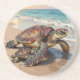Ein küstenthemes Untersetzer mit einer Illustration einer Mama-Meeresschildkröte und ihrem Baby, die in die blauen Ozeanwellen an einem Sandstrand kriechen.