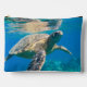 Unterwasseraufnahme einer Meeresschildkröte, die in kristallklarem Wasser direkt unter der Oberfläche schwimmt.