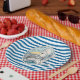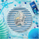 Heller blauer und weißer horizontaler Musterentwurfs-Papier-Teller mit einer Meerjungfrau und einem Anker.