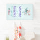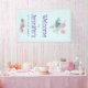 Begrüßungsbanner zum Geburtstag mit einer anmutigen Abbildung. Entworfen mit einer hübschen Meerjungfrau, die einen glücklichen Delphin reitet. Ein kleiner Quallenfreund begleitet sie. Dekoriert mit kleinen Spritzern von Imitaten Gold Glitzer. Muscheln und Seesterne am Boden. Hellblauer Hintergrund mit verblassten rosa Polka-Punkten.