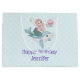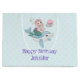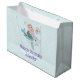 Geschenktasche mit einer ansprechenden Abbildung. Entworfen mit einer hübschen Meerjungfrau, die einen glücklichen Delphin reitet. Ein kleiner Quallenfreund begleitet sie. Dekoriert mit kleinen Spritzern von Imitaten Gold Glitzer. Hellblauer Hintergrund mit verblassten rosa Polka-Punkten.